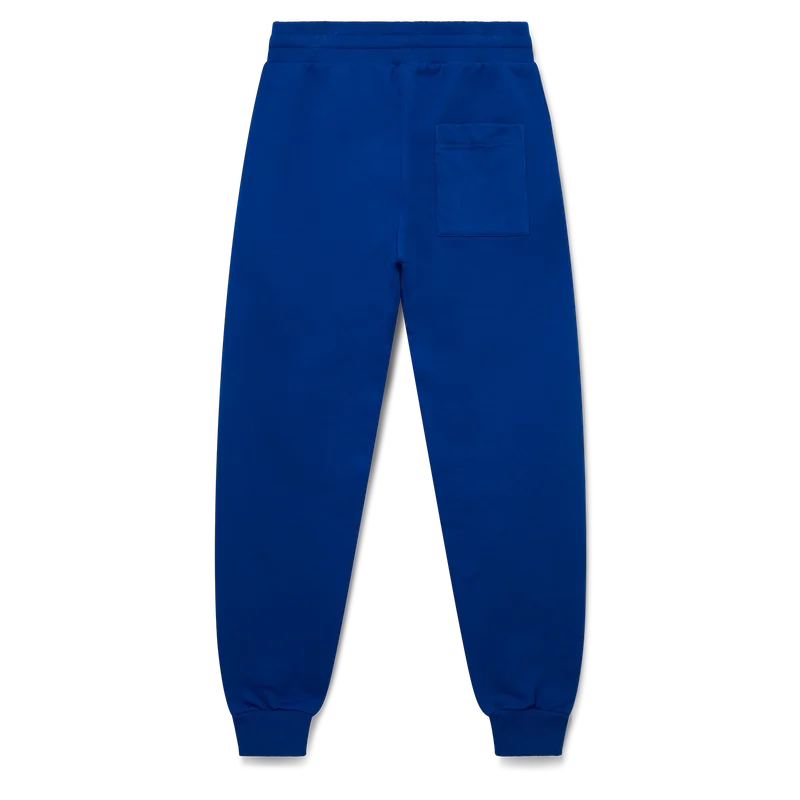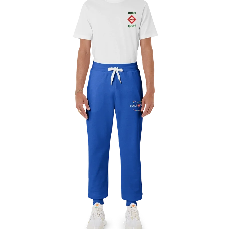 I pantaloni della tuta blu in cotone biologico Drapeau De Collombes presentano una grafica stagionale che incorpora l’iconografia Casa Sport, segno distintivo della Maison. Completati da coulisse con puntali dorati, polsini elasticizzati, tasche laterali ed etichetta con il marchio Casablanca Paris, sono progettati per una vestibilità classica.
