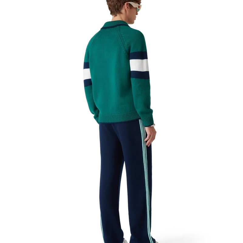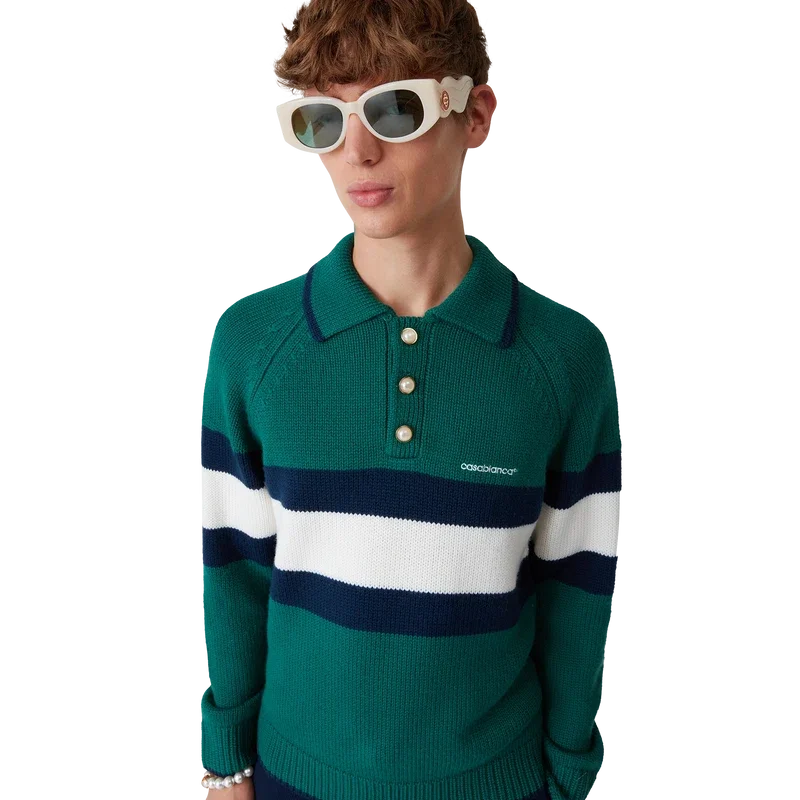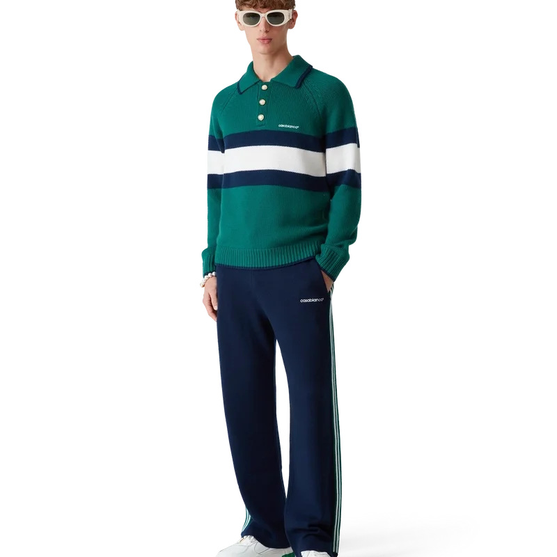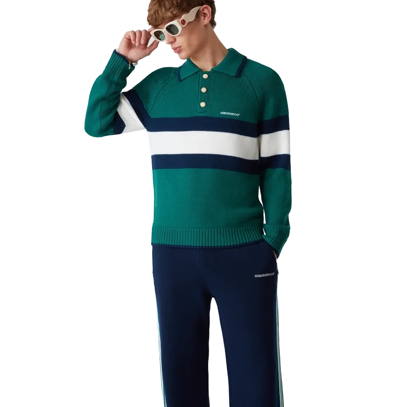 La polo a blocchi di colore è un modello a maniche lunghe realizzato in tessuto di lana merino e presenta una striscia blu e bianca sul petto e sulla schiena. Completata da maniche raglan, polsini, orlo e colletto a costine, bottoni in madreperla con bordo dorato e logo Casablanca.