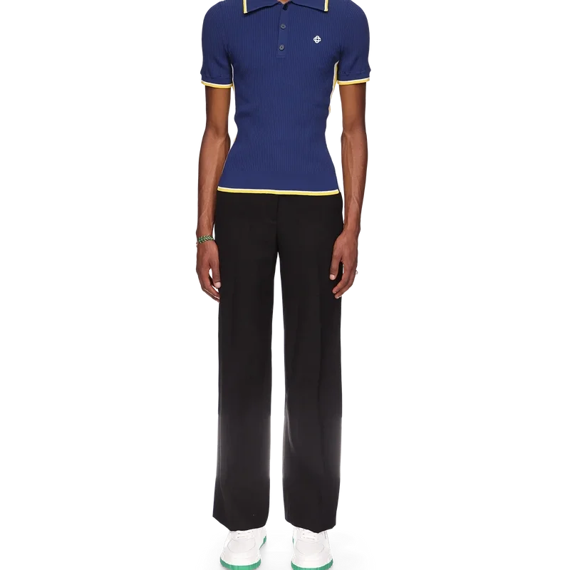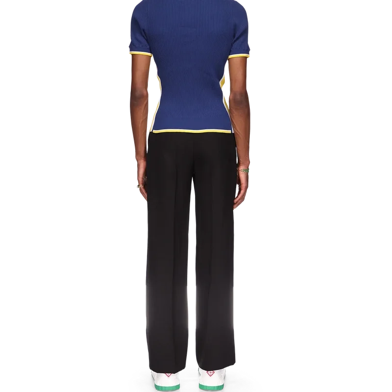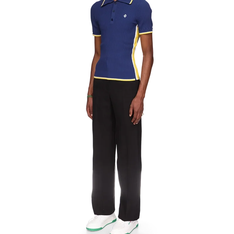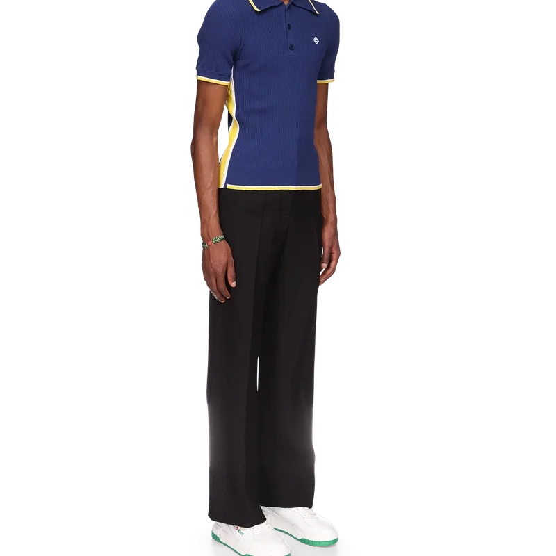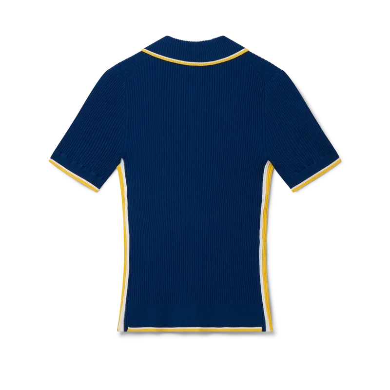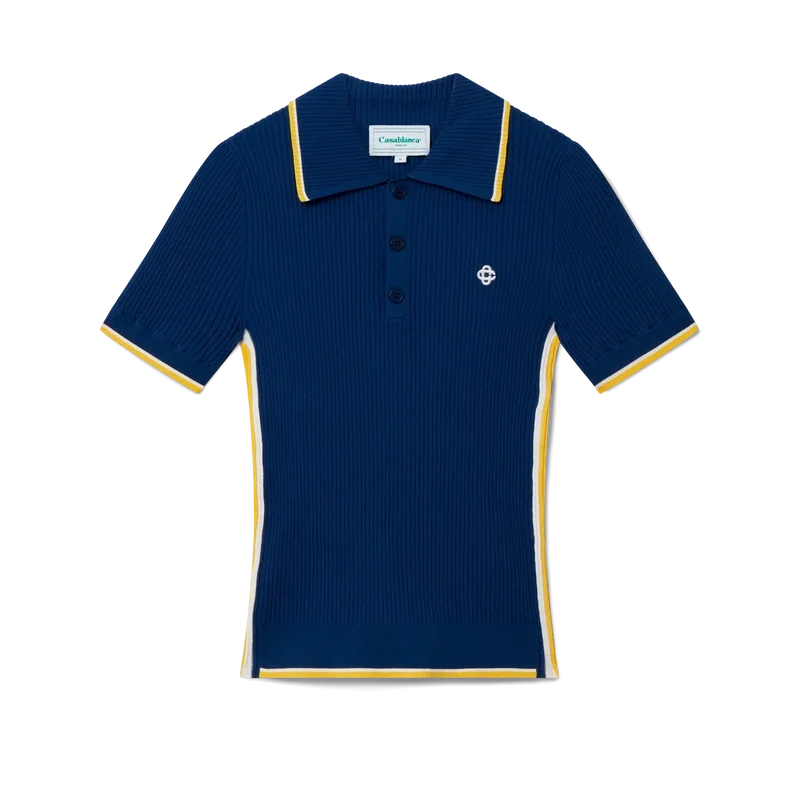 La polo a costine in maglia è realizzata in tessuto a costine in misto viscosa. Rifinita con dettagli a contrasto su colletto, polsini e orlo, strisce gialle e bianche lungo i lati, bottoni con il logo Cc intrecciato della Maison e logo Cc ricamato sul petto.
