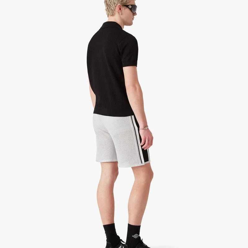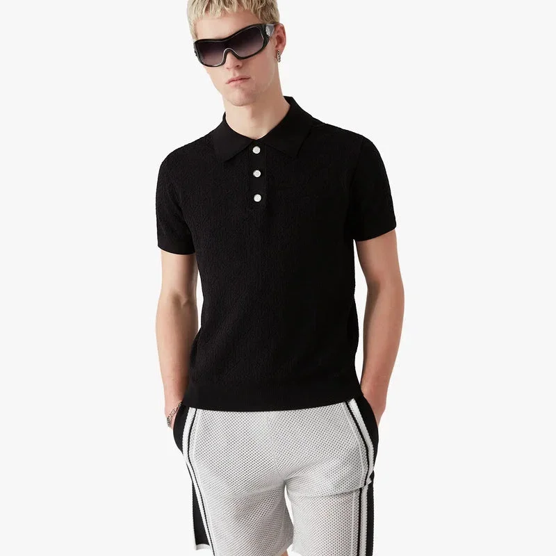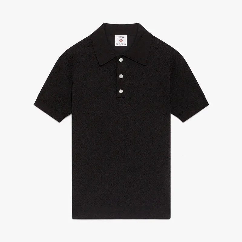 La polo a maniche corte nera con motivo Monogram in punto traforato presenta un raffinato design in maglia, caratterizzato da una trama traforata aperta con il motivo Monogram iconico della Maison. Completata da colletto e abbottonatura a costine, chiusura con bottoni, bottoni con logo CC intrecciato e bordo argentato, e dettagli a costine su polsini e orlo.