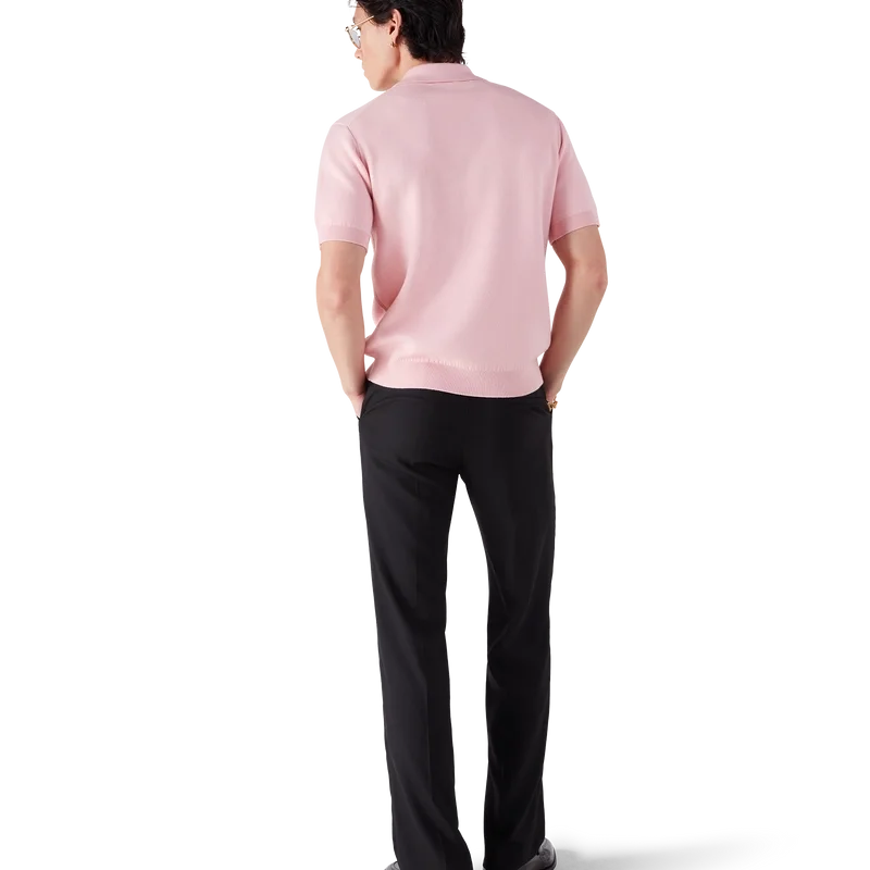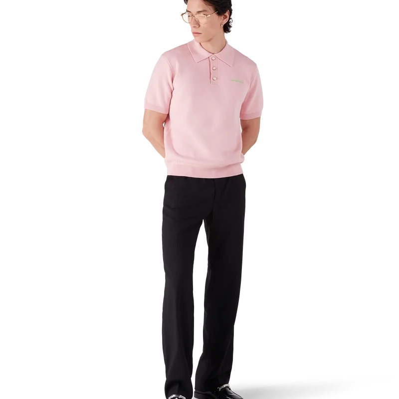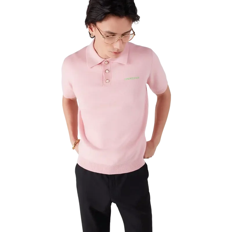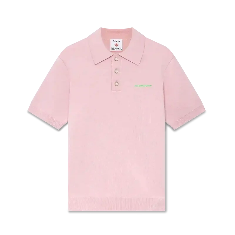 La polo a maniche corte in maglia di lana merino presenta un design classico con il logo Casablanca della Maison. È rifinita con abbottonatura a tre bottoni, bottoni in madreperla con bordo dorato e dettagli a costine su colletto, polsini e orlo.