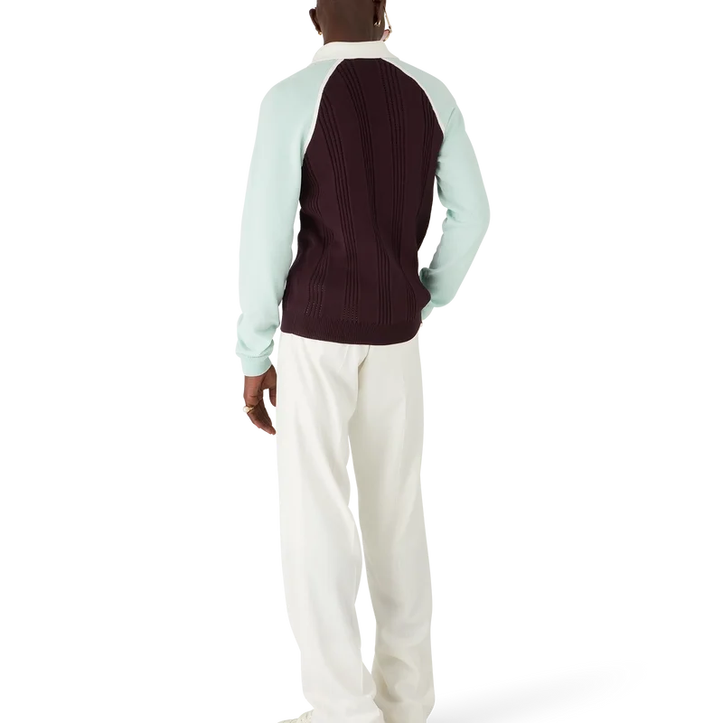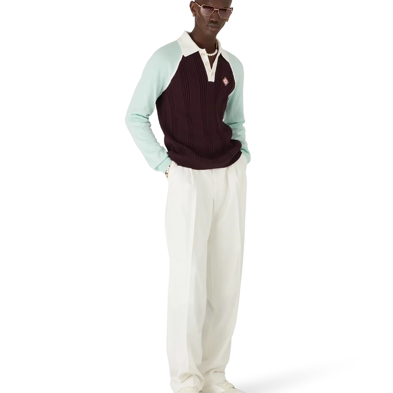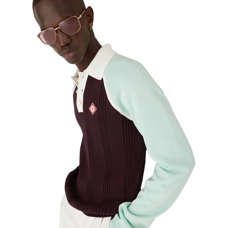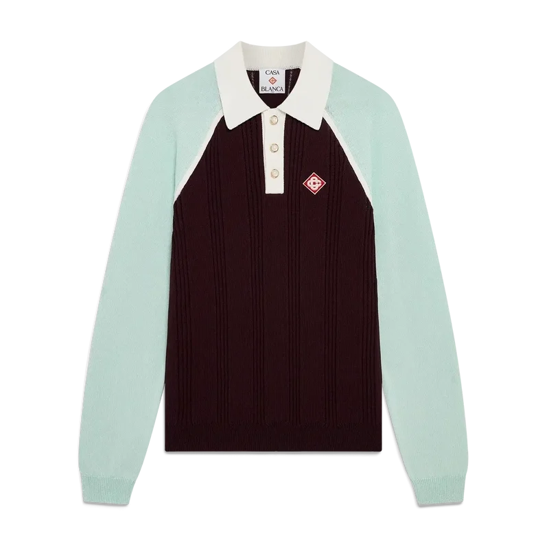La polo da tennis a maniche lunghe è un modello in maglia realizzato in cotone, caratterizzato dalla toppa con il logo a rombi iconico della Maison. Completata da colletto e abbottonatura a costine bianche, chiusura con bottoni, maniche raglan color menta e bottoni in madreperla con bordo dorato iconici.
