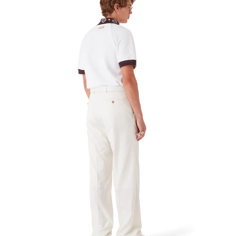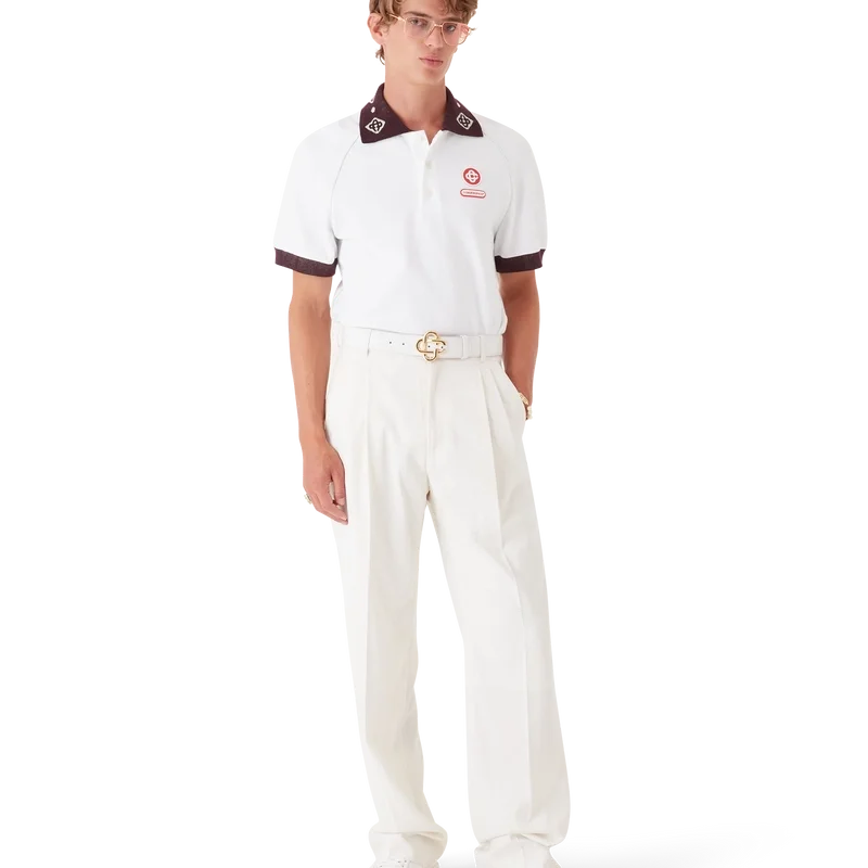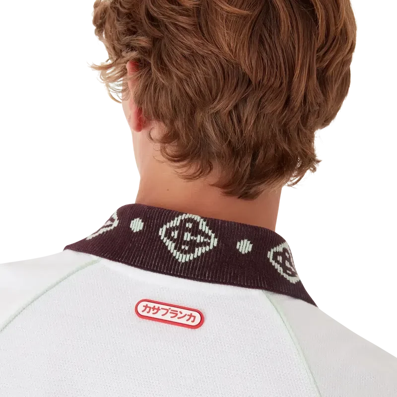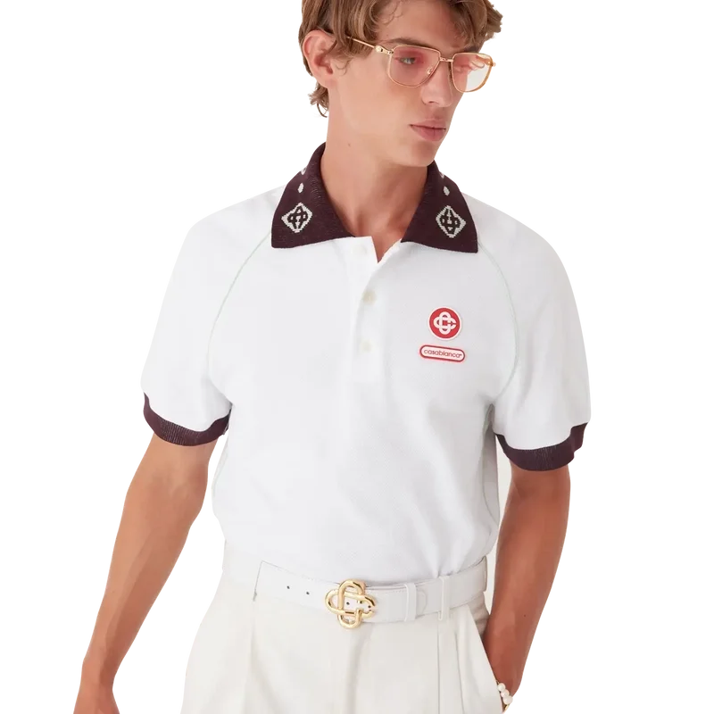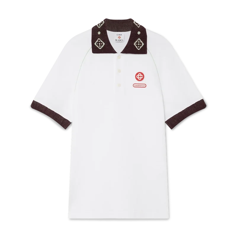 La polo in piqué è un modello classico che presenta il logo CC della Maison e una toppa con il logo Casablanca, realizzata in tessuto piqué di cotone biologico. Completata da un colletto a maglia a contrasto con il nostro iconico logo CC intrecciato, polsini a contrasto, chiusura con abbottonatura a tre bottoni, maniche raglan, bottoni in corozo con logo CC intrecciato e logo Casablanca sotto il colletto scritto in giapponese.