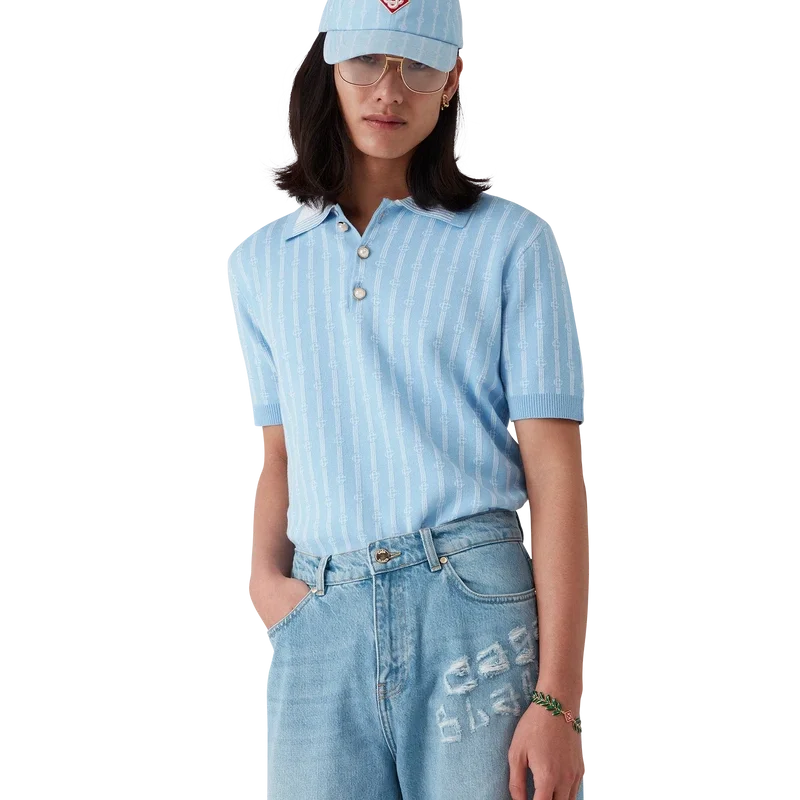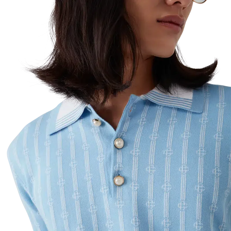 La polo Monogram è un modello a maniche corte realizzato in tessuto misto cotone con classica abbottonatura a tre bottoni. Rifinita con i caratteristici bottoni in madreperla con bordo dorato della Maison, polsini a costine, orlo e colletto con bordi rifiniti.