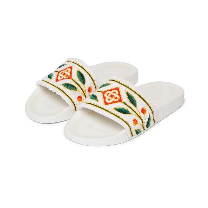 Le ciabatte da uomo in spugna ricamata sono realizzate in tessuto spugna e presentano il logo a diamante della Maison e il caratteristico motivo Laurel sulla tomaia. Completate da un plantare sagomato per un comfort superiore e da una suola gommata testurizzata che unisce prestazioni e stile casual.