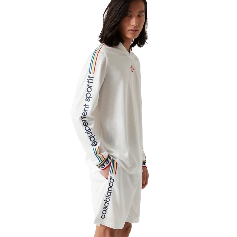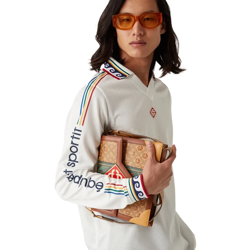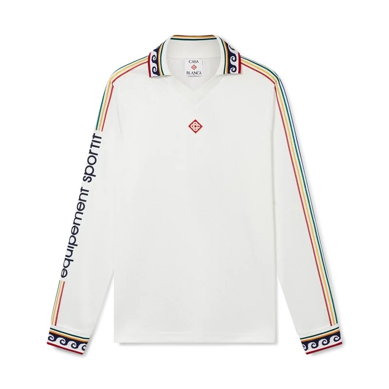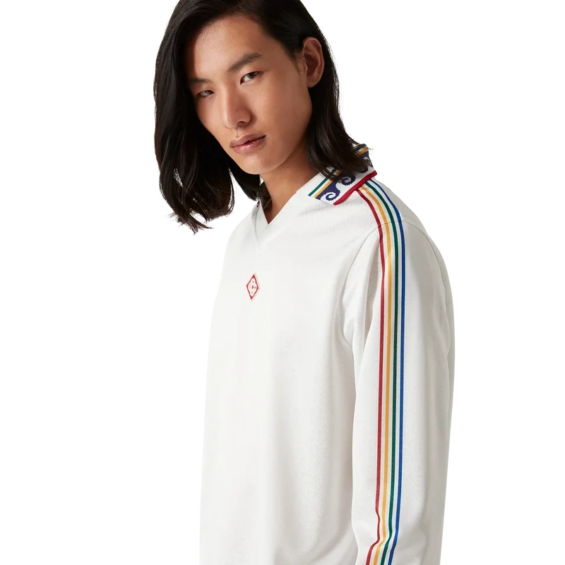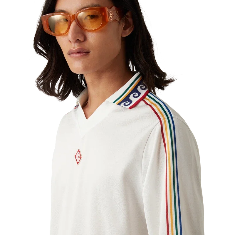 La camicia da calcio con monogramma jacquard è un modello a maniche lunghe con stampa all-over che presenta il monogramma Cc intrecciato della Maison, realizzata in tessuto jacquard con monogramma. Rifinita con collo e polsini a costine, marchio Casablanca lungo le maniche e il caratteristico logo Diamond Monogram sul collo.