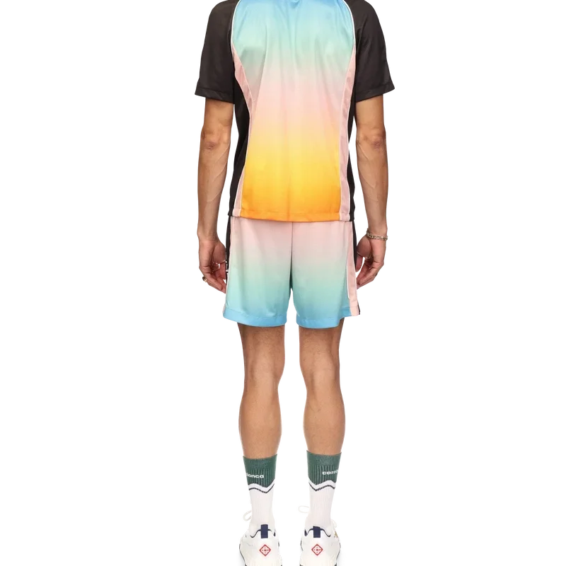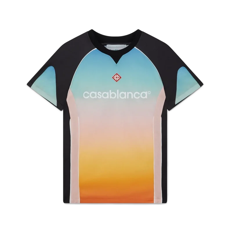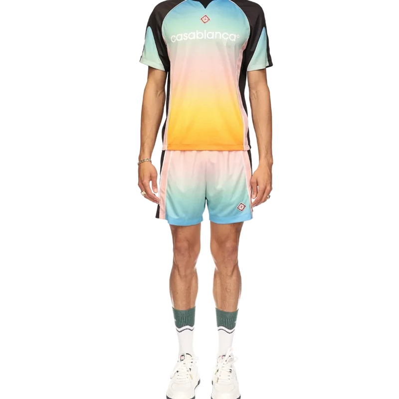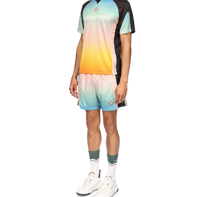 La maglia da calcio con sfumature pastello è un capo sportivo a maniche corte caratterizzato da una serie di sfumature di colori pastello che sottolineano i temi eterei fondamentali del nostro marchio. Realizzata in rete Birdseye e rifinita con la toppa con il logo a diamante della casa e il logo Casablanca sul petto, presenta un classico collo a giro.