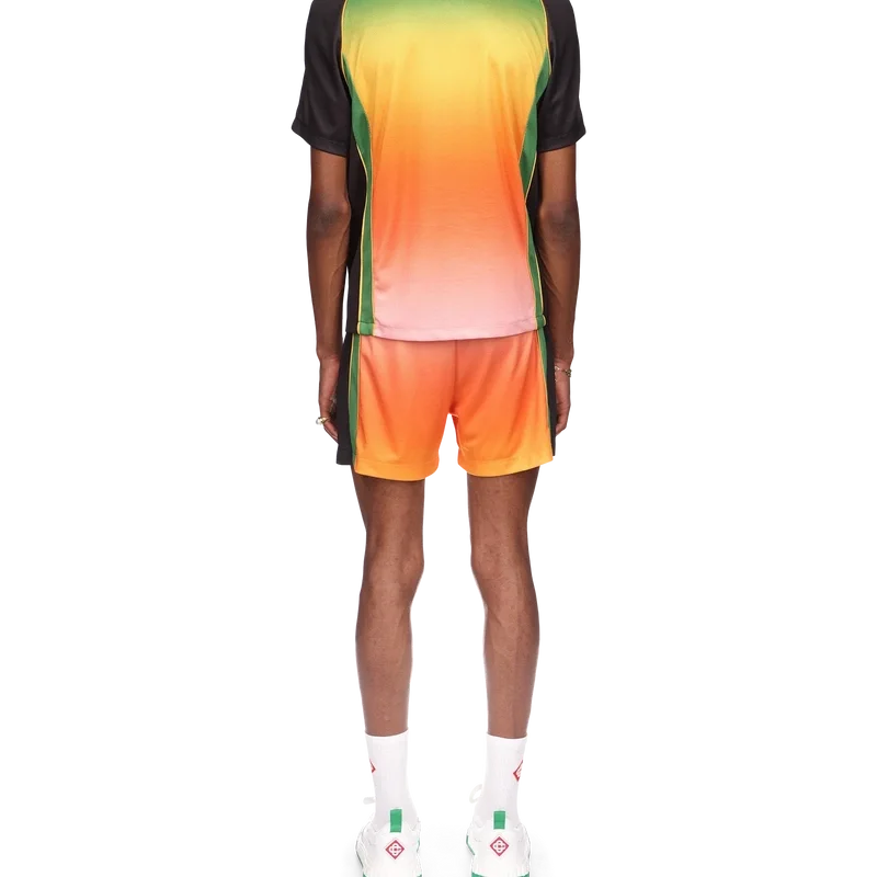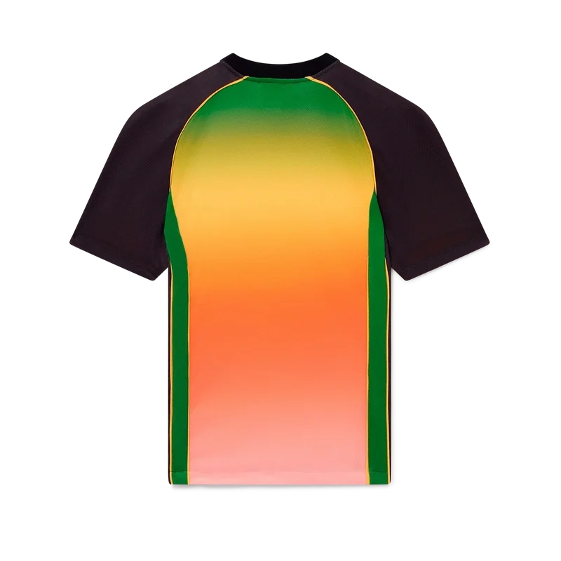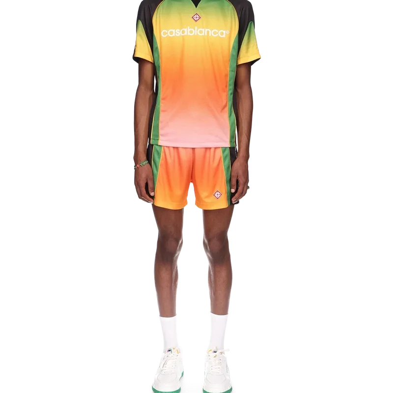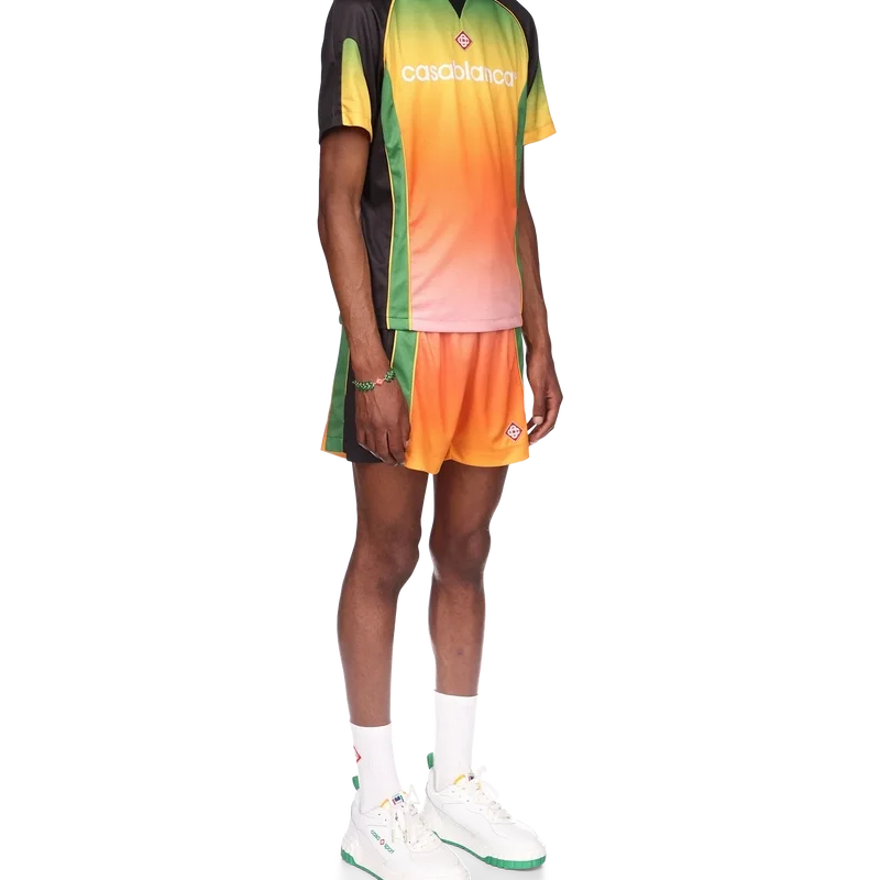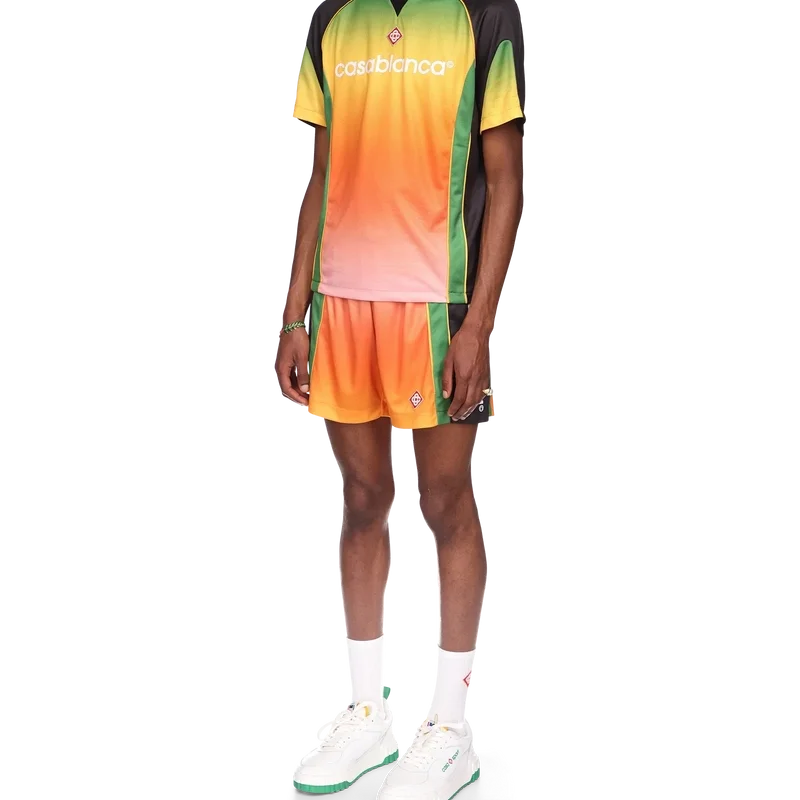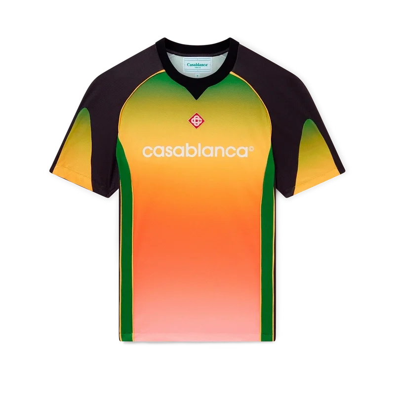La camicia da calcio Gradient è un capo sportivo a maniche corte caratterizzato da una serie di colori sfumati che rappresentano i ricchi scambi tra le discipline culturali nell’arte, nella musica e nel cinema africani. Realizzata in rete Birdseye e rifinita con la toppa con il logo a diamante della casa e il logo Casablanca sul petto, con un classico collo a giro.