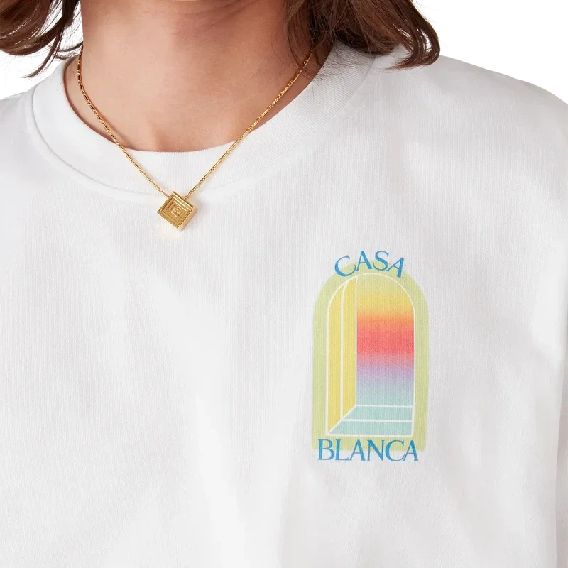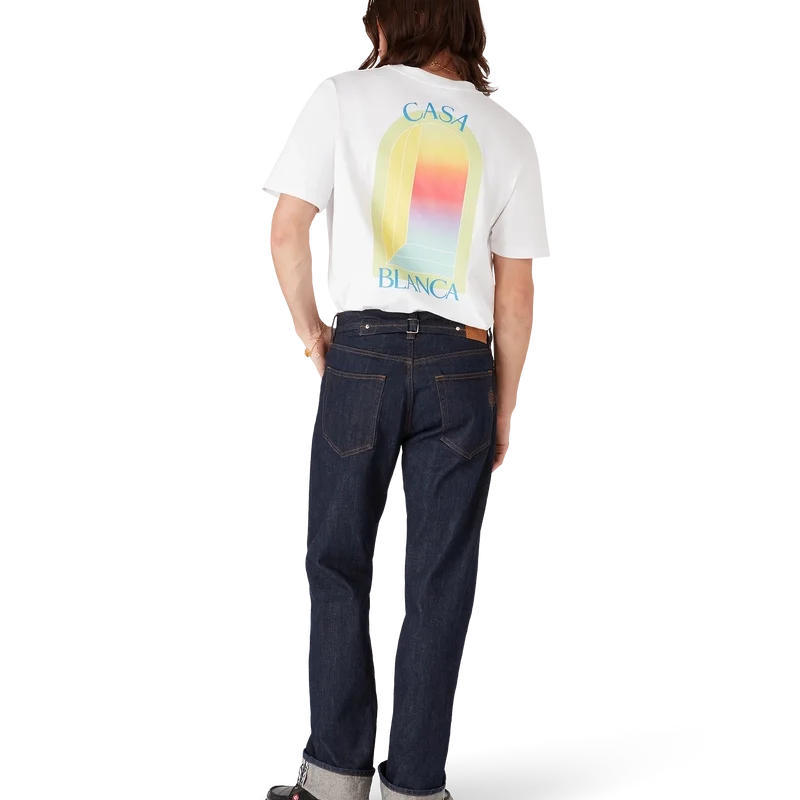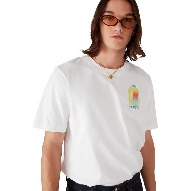 La T-shirt L’arche è un modello a maniche corte caratterizzato da una stampa serigrafata dell’Arco, simbolo astratto di forza, realizzata in cotone biologico. Rifinita con scollo rotondo a costine.