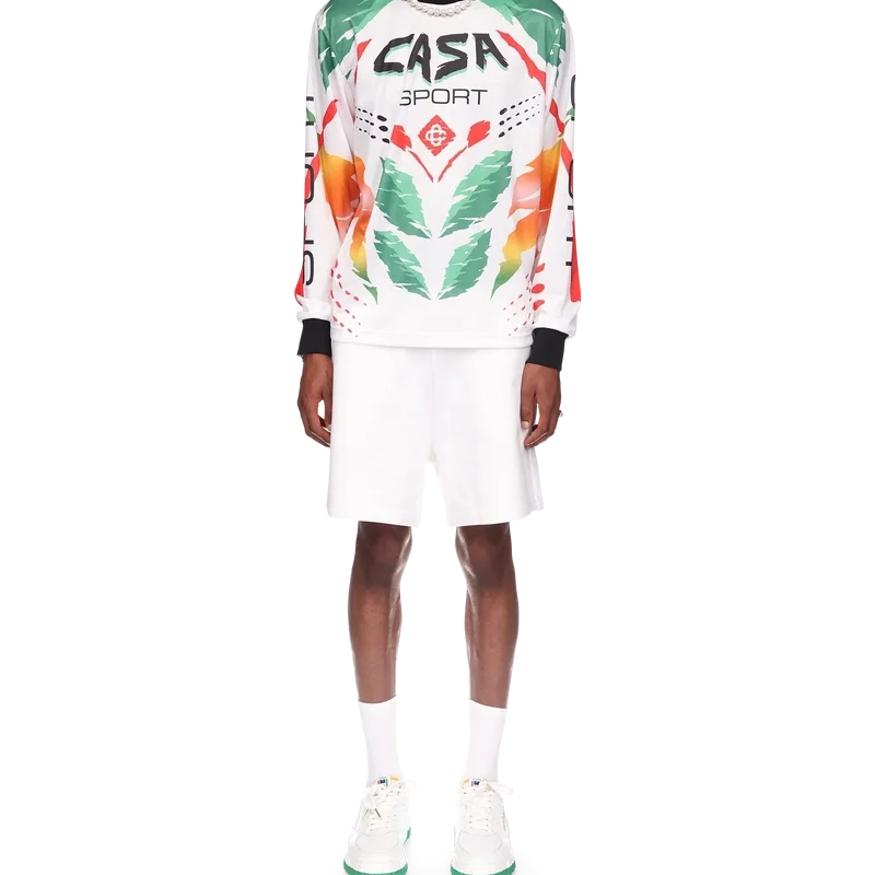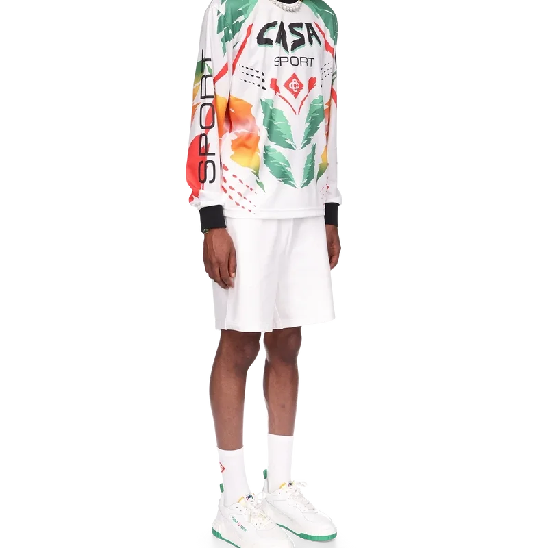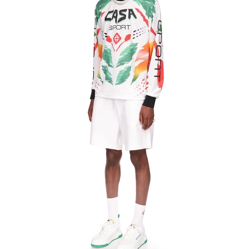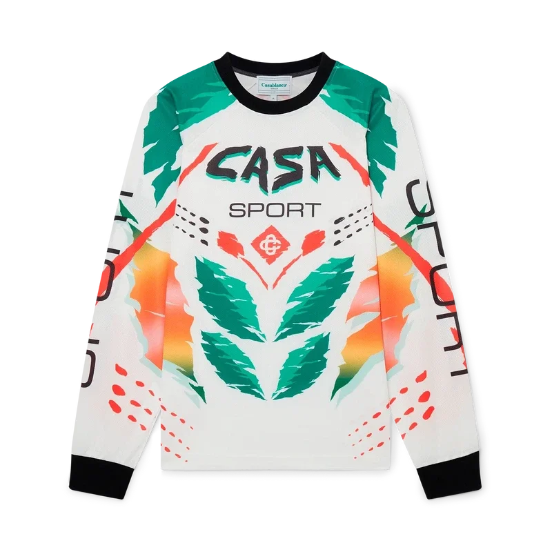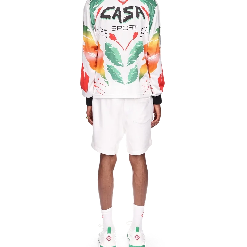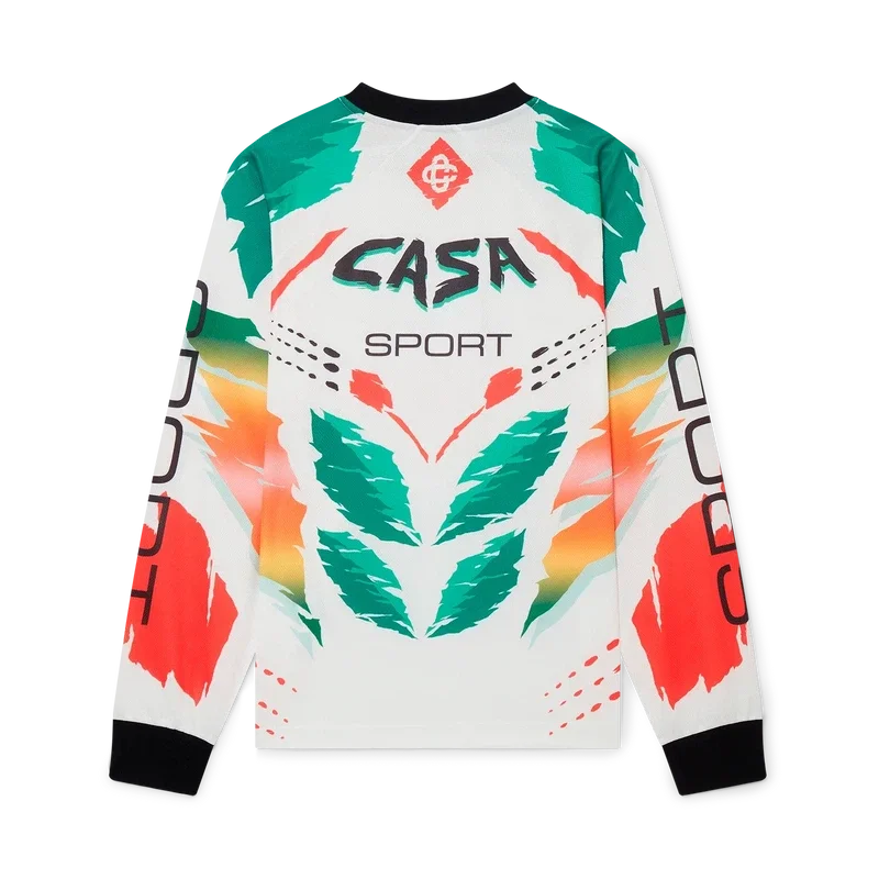 La T-shirt a maniche lunghe Casa Moto presenta un design stampato di ispirazione sportiva con il logo CC intrecciato della Maison e i caldi colori della stagione, rappresentativi dei ricchi scambi tra le discipline culturali nell’arte, nella musica e nel cinema africani. Completata da colletto e polsini a costine a contrasto.
