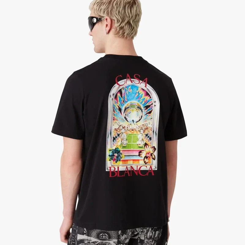 La T-shirt a pantaloncini Black Tennis Landscape presenta un design raffinato, caratterizzato da un’opera d’arte in cui cornici interconnesse creano nicchie di scene diverse che descrivono la trascendenza del tempo e dello spazio attraverso il focus dello sport. Completata da un classico girocollo.