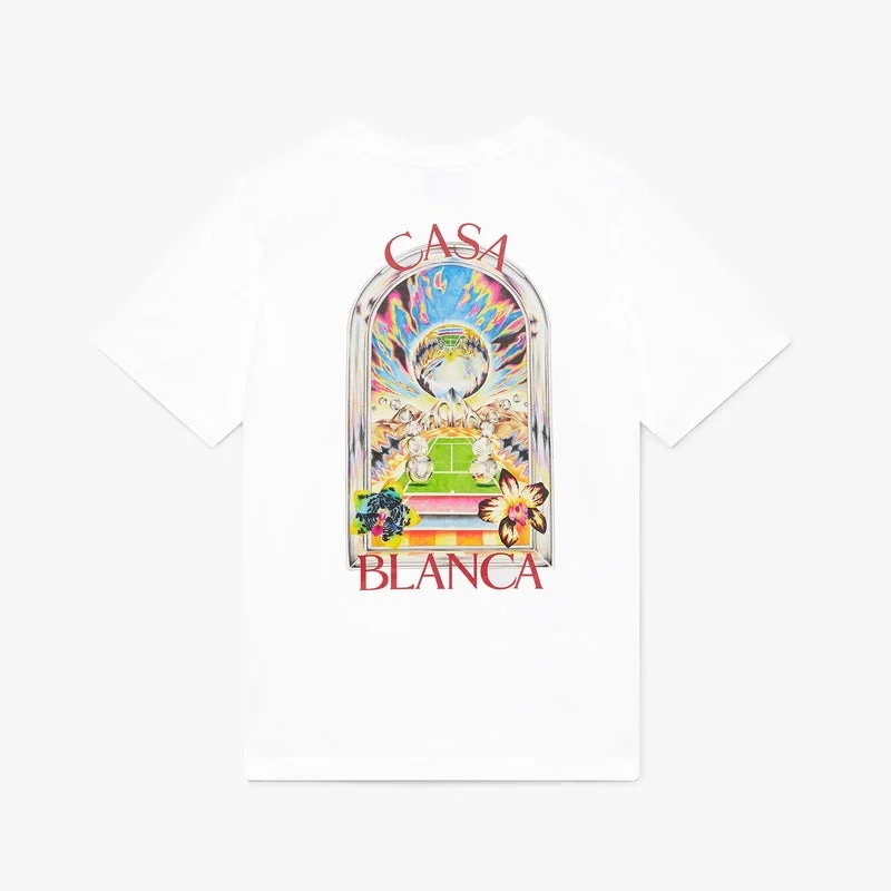 La T-shirt a maniche corte White Tennis Landscape presenta un design raffinato, caratterizzato da un’opera d’arte in cui cornici interconnesse creano nicchie di scene diverse che descrivono la trascendenza del tempo e dello spazio attraverso la lente dello sport. Completata da un classico scollo rotondo e da una silhouette morbida.