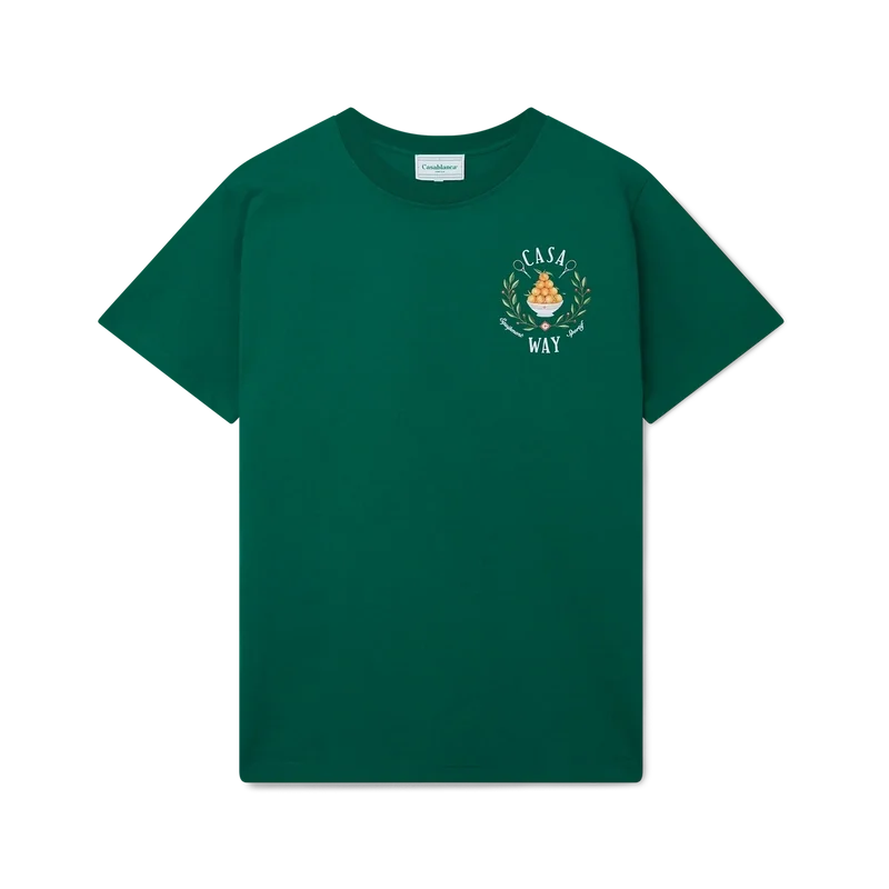 La T-shirt Casa Way presenta una stampa dell’iconica grafica classica della Maison con la piramide arancione, le racchette da tennis e un motivo floreale ripetuto in una stampa più grande sul retro. Realizzata in cotone biologico al 100% e rifinita con un classico girocollo e un’etichetta con il marchio Casablanca.