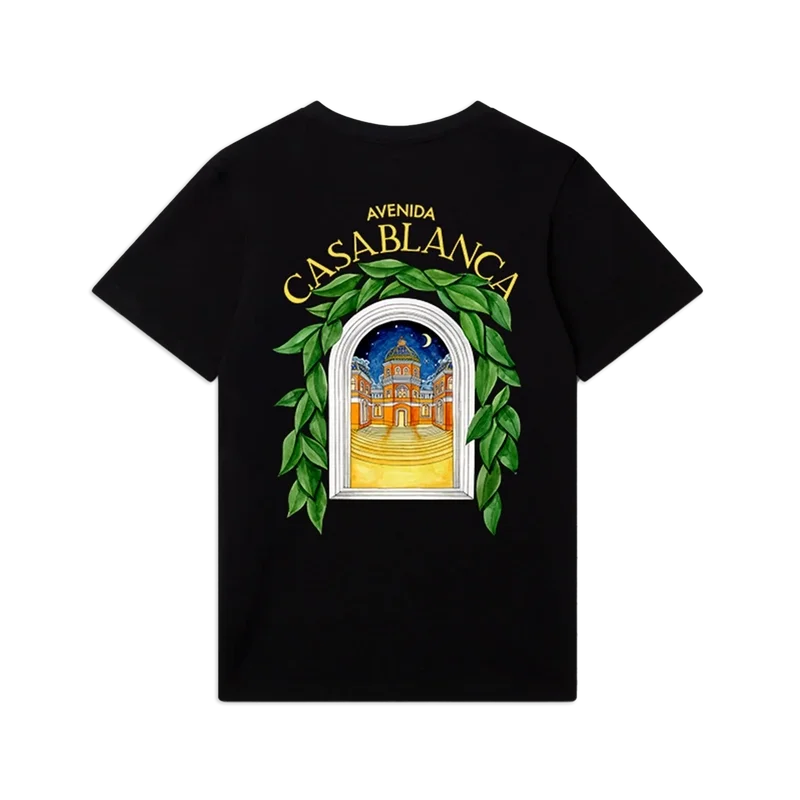 La T-shirt Casablanca Avenida in nero presenta una grafica serigrafata stagionale in cui il libero fluire della natura incontra la struttura del design artificiale dell’arco, un simbolo astratto di forza. Realizzata con classico girocollo, maniche corte ed etichetta con il marchio Casablanca Paris, progettata per una vestibilità comoda.