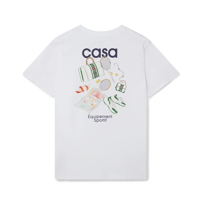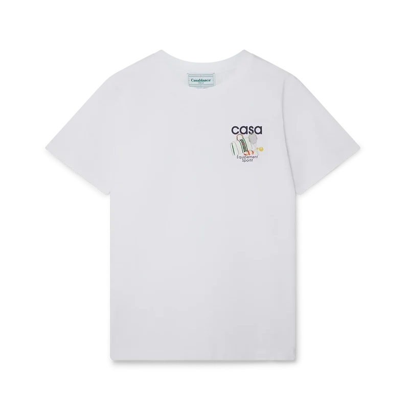 La T-shirt Equipement Sportif presenta una stampa dell’opera d’arte iconica della Maison, reinterpretata per questa stagione, sulla zona sinistra del petto e ripetuta in una stampa più grande sul retro. Realizzata in 100% cotone biologico e rifinita con un classico girocollo e un’etichetta con il marchio Casablanca.