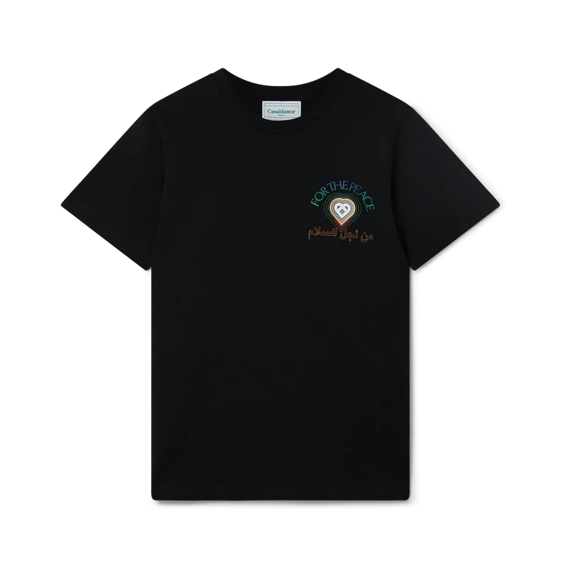 La T-shirt nera in cotone biologico “For the Peace” presenta la grafica stagionale “For the Peace”, un tributo a coloro che combattono ogni forma di oppressione e aprono la strada a un futuro migliore per tutti. Caratterizzata da un classico girocollo, maniche corte ed etichetta con il marchio Casablanca Paris, progettata per una vestibilità comoda.