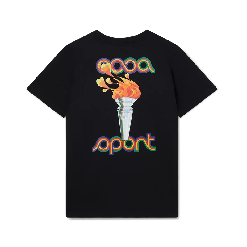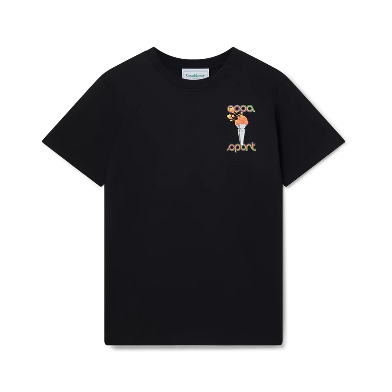 La T-shirt in cotone biologico serigrafata La Flamme Du Sport presenta una grafica stagionale che incorpora l’iconografia della Maison.
