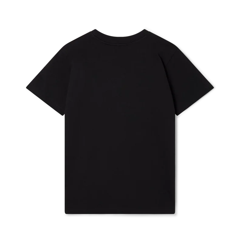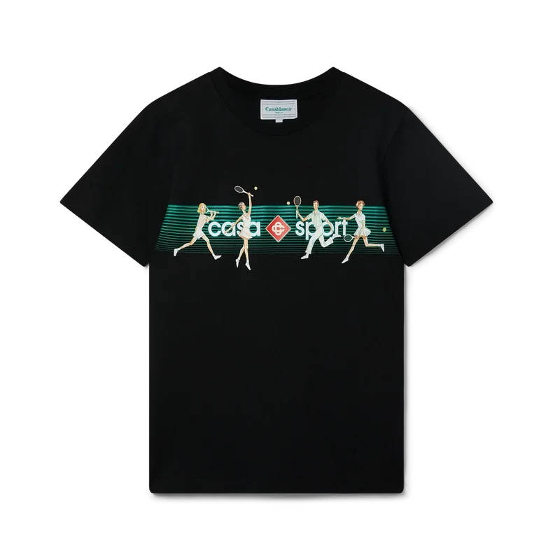 La T-shirt in cotone biologico con stampa serigrafata Playful Stripes presenta una grafica stagionale che incorpora l’iconografia del tennis e di Casa Sport, segni distintivi della Maison.