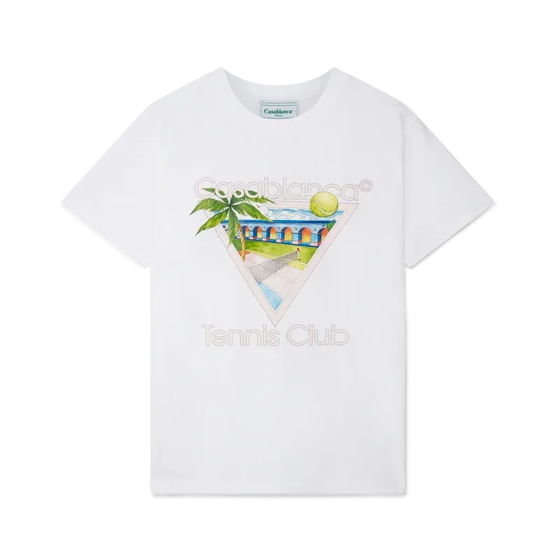 La T-shirt Tennis Club Icon presenta una stampa serigrafata con il motivo iconico della Maison, reinterpretato per questa stagione incorporando elementi di tennis, natura e architettura. Realizzata in jersey bianco e rifinita con un classico girocollo e un’etichetta con il marchio Casablanca.
