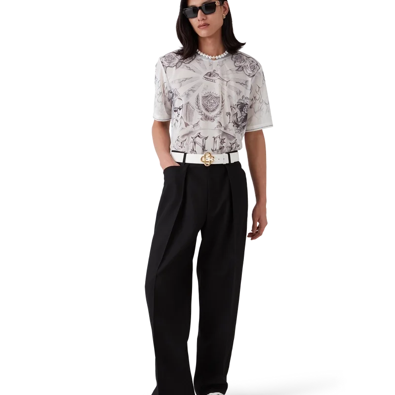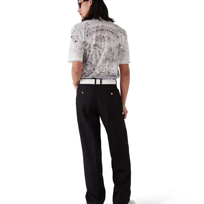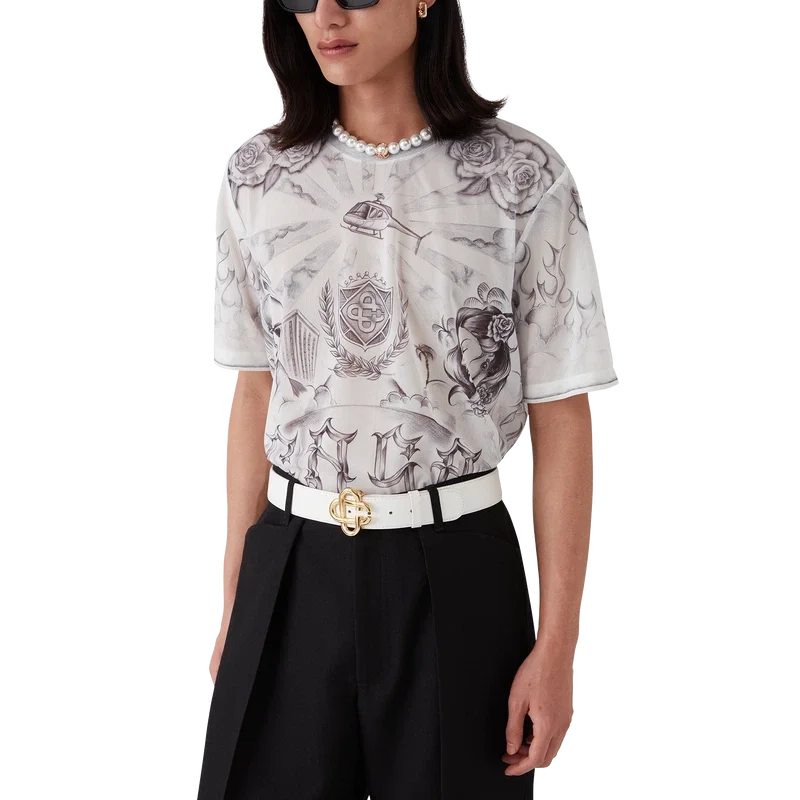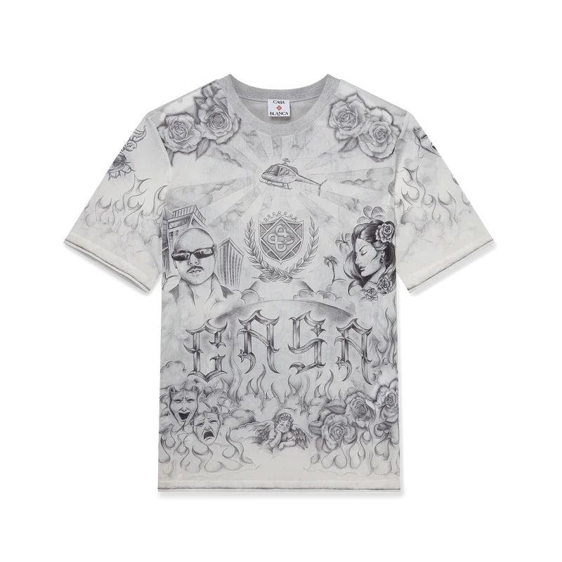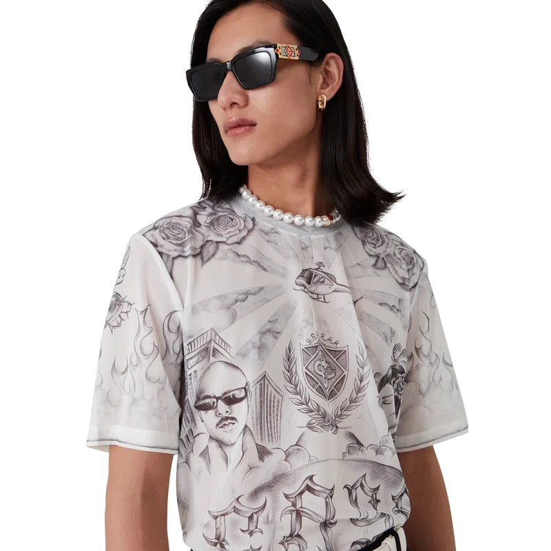 Il top in rete Tattoo è un modello a maniche corte realizzato in tessuto a rete stampato con le grafiche di stagione, ispirato alla scena del quartiere La e che fa riferimento alla ricca cultura dei tatuaggi e agli inchiostri grigi e neri utilizzati in questi tatuaggi. Completato da un classico girocollo.